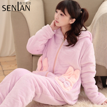 新款双层加厚珊瑚绒睡衣女秋冬长袖可爱连帽甜美睡衣家居服女套装