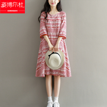 2017新款夏装少女文艺复古格子收腰长裙初中学生棉麻短袖连衣裙子