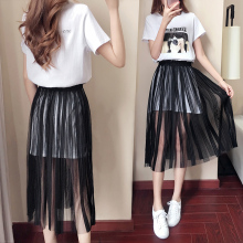 2017款网纱连衣裙女夏两件套T恤高腰短袖时尚黑白中长款半身裙潮