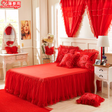 罗梦雨大红色纯棉婚庆蕾丝床罩韩式全棉纯色单件床裙保护套可定做