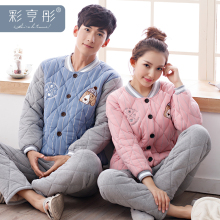 彩亨彤冬季加厚三层夹棉情侣家居服套装长袖保暖睡衣男女开衫棉袄