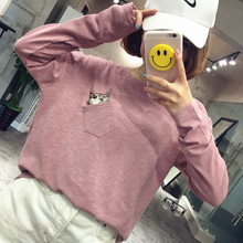 韩国代购2017春装宽松大码卡通竹节棉T恤女长袖刺绣蝙蝠袖上衣潮