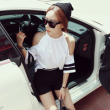 春夏天新款韩版女装学院风日系时尚条纹袖露肩短袖T恤上衣服学生
