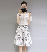 2017夏装新款韩版女装显瘦圆领短袖镂空蕾丝上衣欧根纱半身裙套装