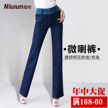 纽伦2017春女款深蓝色牛仔裤新款修身长裤显瘦高腰绣花喇叭裤4572