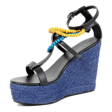 特卖裂帛2015夏串珠绑带坡跟罗马一字凉鞋麻绳高跟女51130914