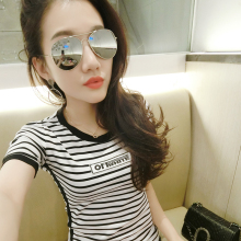 欧洲站2017夏装欧货新款简约刺绣字母休闲横条纹t恤女短袖上衣潮