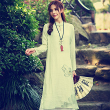 2017春装新款民族风大码女装长裙子中国风手绘修身长袖棉麻连衣裙