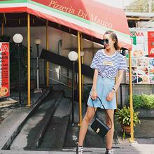 九茵2017新款条纹字母圆领T恤高腰短裙套装