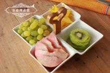 纯白陶瓷点心水果盘 四分格 连格木制手把早餐果盘 木制手把提手