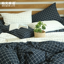 全棉格纹水洗棉四件套 简约白色格子床上用品 纯棉床笠被套4件套