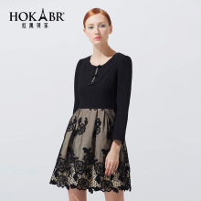 红凯贝尔春装新品女装韩版修身圆领镂空钩花拼接蕾丝连衣裙女