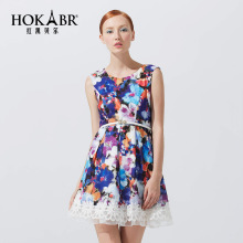 红凯贝尔夏装新品无袖拼接雪纺连衣裙时尚百褶印花可拆卸长裙