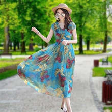 2017新款夏季有袖连衣裙夏高腰V领到脚踝的带袖雪纺波西米亚长裙