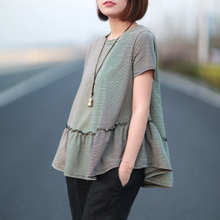 2017夏装新款 文艺休闲荷叶下摆条纹T恤女圆领短袖宽松大码女装