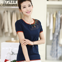 2017夏装新款纯棉T恤女短袖大码中年绣花圆领修身民族风女装t恤衫