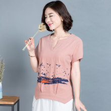2017夏装新款女装短袖t恤v领显瘦中年妈妈装大码宽松纯棉上衣印花