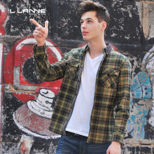 LLANNE英伦潮牌绿格子衬衫男长袖磨毛休闲修身加厚法兰绒条绒衬衣