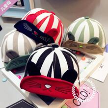 韩版春秋季儿童猫咪耳朵软檐帽男女宝宝条纹棒球帽翻檐帽鸭舌帽子