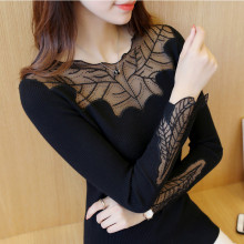 春装新款修身女装枫叶蕾丝镶钻v领长袖针织衫弹力打底衫通勤韩版