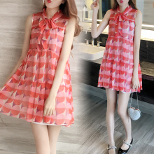 2017夏无袖连衣裙韩版中长款蝴蝶结撞色条纹宽松娃娃裙A字纱裙女
