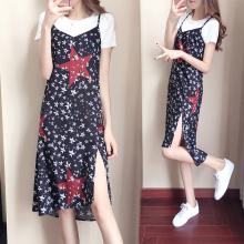 2017新款韩版夏两件套短袖T恤印花雪纺中长款吊带裙连衣裙套装女