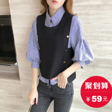 两件套上衣春装新款2017韩版灯笼袖条纹衬衣+开叉小马甲外套套装