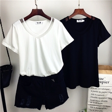 加肥加大码女装2017夏季新款胖mm大码宽松短袖V领露肩显瘦基础T恤