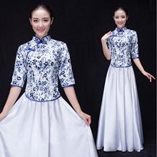 2017新款春夏青花瓷合唱服长裙二胡琵琶演出服大合唱演出服成人女