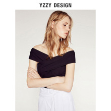英子著衣黑色交叉领修身露肩吊带背心短款纯色针织衫打底衫毛衣女