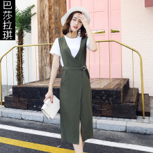 吊带连衣裙两件套2017夏季女装新款亚麻时尚套装气质T恤背带裙