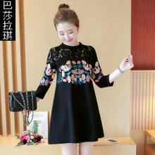 2017春季女装新款上衣打底衫时尚百搭蕾丝拼接印花七分袖中长T恤