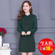 2017春装新款雪纺长袖圆领连衣裙女钉珠中长款A字裙打底包臀裙子