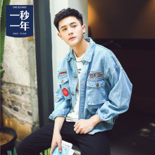 一秒一年潮男学生外套贴布牛仔夹克男 春季秋天日系复古男牛仔服