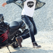 新款韩版破洞补丁缝补男式修身弹力小脚小直筒男士牛仔裤