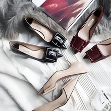 【老果家】2017春天新款尖头方扣中跟真皮女鞋漆皮韩版细跟单鞋女