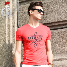 长人夏季双丝光棉打底衫男士V领短袖修身印花T恤韩版上衣体恤衫潮