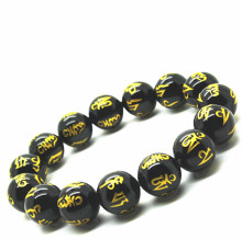 沐禾 G0085开光黑曜石 鎏金藏文六字真言 圆珠 大明咒佛珠手链
