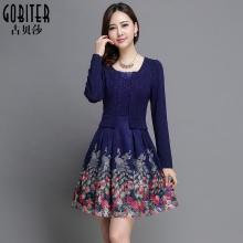 古贝莎妈妈装2017春秋女装假两件拼接显瘦打底蕾丝刺绣长袖连衣裙