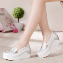 春季新款高跟坡跟单鞋女真皮厚底松糕鞋圆头软底休闲妈妈鞋女鞋子