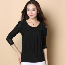 春秋大码女网纱圆领烫钻打底衫长袖弹力纱衣宽松遮肚子显瘦T恤胖M