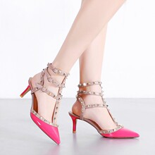 17欧美明星时尚大牌新款铆钉细跟尖头真皮凉鞋