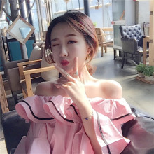 韩国2017店主怒推!春季新款一字荷叶领气质拼色粉嫩大喇叭袖衬衫