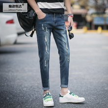 2017春夏款青少年小脚乞丐牛仔裤男生修身裤男士韩版破洞九分裤潮
