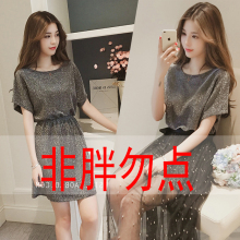 大码女装胖mm2017夏装新款套装200斤亮丝网纱两件套中长款连衣裙