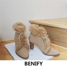 BENIFY真皮兔毛短靴磨砂皮短筒加绒女靴尖头高跟裸靴及踝靴2186