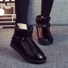 亮片皮面防水冬季搭扣铆钉短筒雪地靴黑色平底女短靴加厚保暖棉鞋