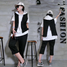 胖mm裤脚斜边马甲三件套夏新款大码女装上衣胖妹妹短袖T恤休闲潮