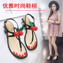 2017夏季新款珍珠粗跟一字扣真皮韩版百搭低跟女鞋子夹趾樱桃凉鞋