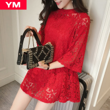 2017春装裙子夏装新款春秋红色韩版套装中长款时尚蕾丝连衣裙女潮